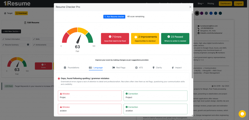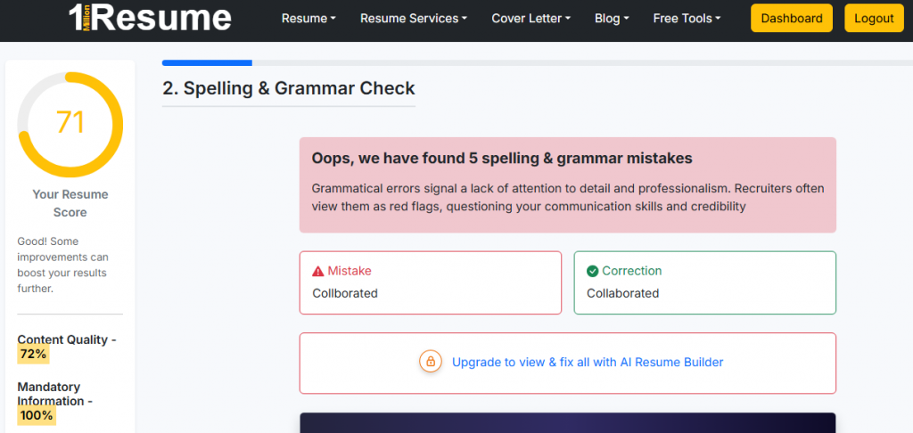 You can use our AI resume builder tool and upload your resume, the in-built resume checker tool will: