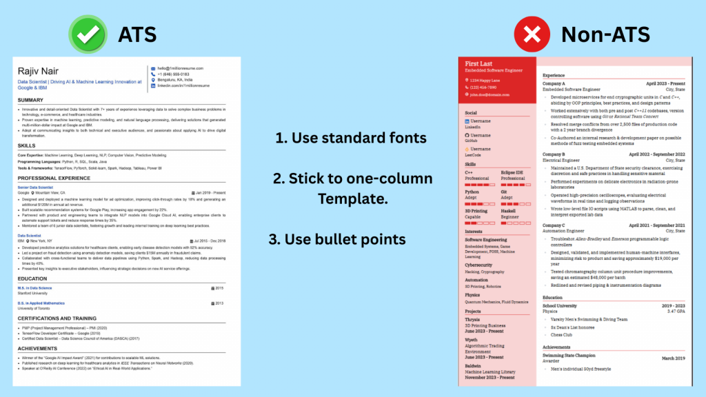 2. Stick to one-column layouts; ATS struggles with multiple columns, headers, and footers.