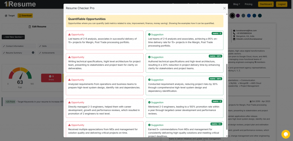 In this method, you can review your resume manually and identify where you can add metrics to improve your resume’s content quality and clearly show your impact to recruiters.